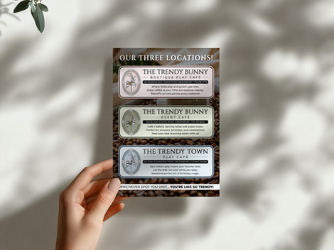 I designed a refined, whimsical logo for The Trendy Town with a carousel and bunny, then updated the logos for the other two locations using matching styles but different colors: pink, green, and blue. I created banners, window graphics, flyers, cards, and web/mobile banners to promote the brand and new location consistently across platforms.